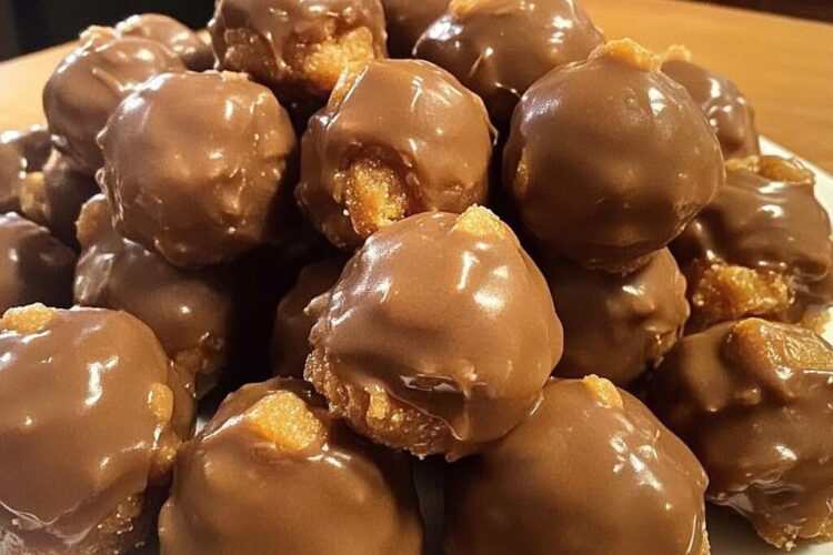 Con un tenedor o palillos de dientes, sumerja cada bolita de mantequilla de maní enfriada en el chocolate derretido, cubriéndola por completo. Retire el exceso de chocolate dando pequeños golpes.